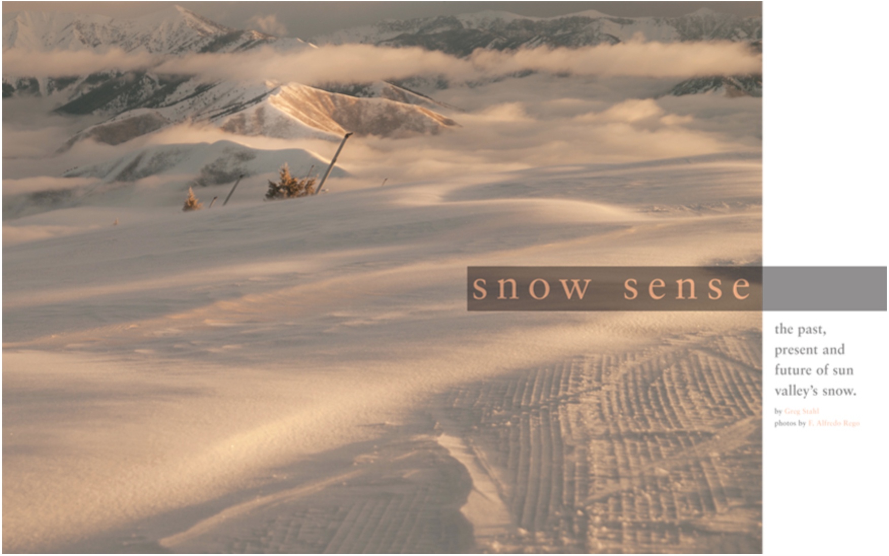 I wrote for Sun Valley Guide magazine as a staff writer and a freelancer and accumulated dozens of glossy magazine clips over the course of 20-odd years, including a handful of award-winning features. Notable stories included the ever-polarizing Northern Rockies wolf reintroduction, the pre-2008 resort-town real estate boom, central Idaho geology and the two articles below: an award-winning piece about the Sawtooth National Recreation Area’s formation and a somewhat etherial conversation about snow.
