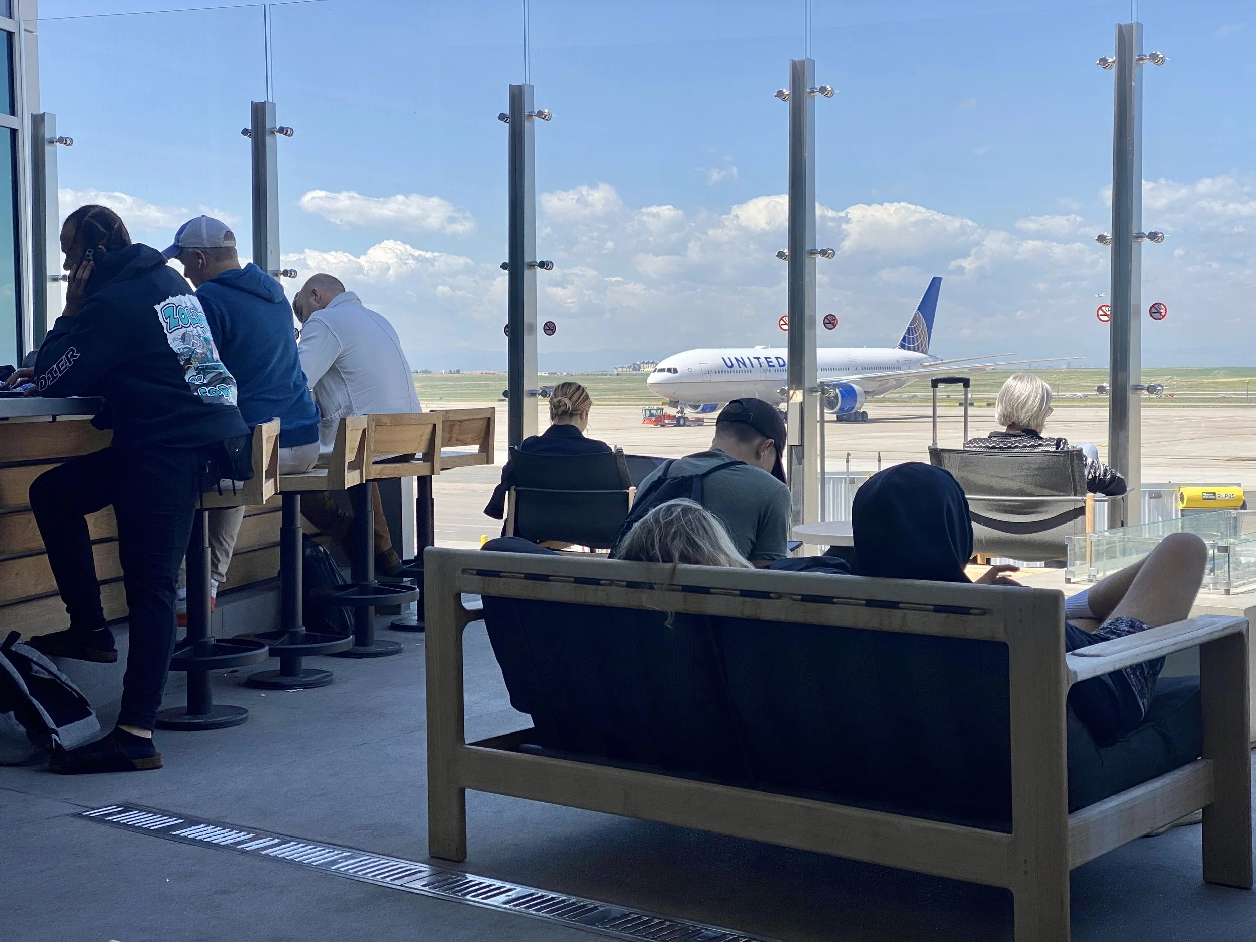 There’s an outdoor patio at the northwest end of Concourse B at Denver International Airport.