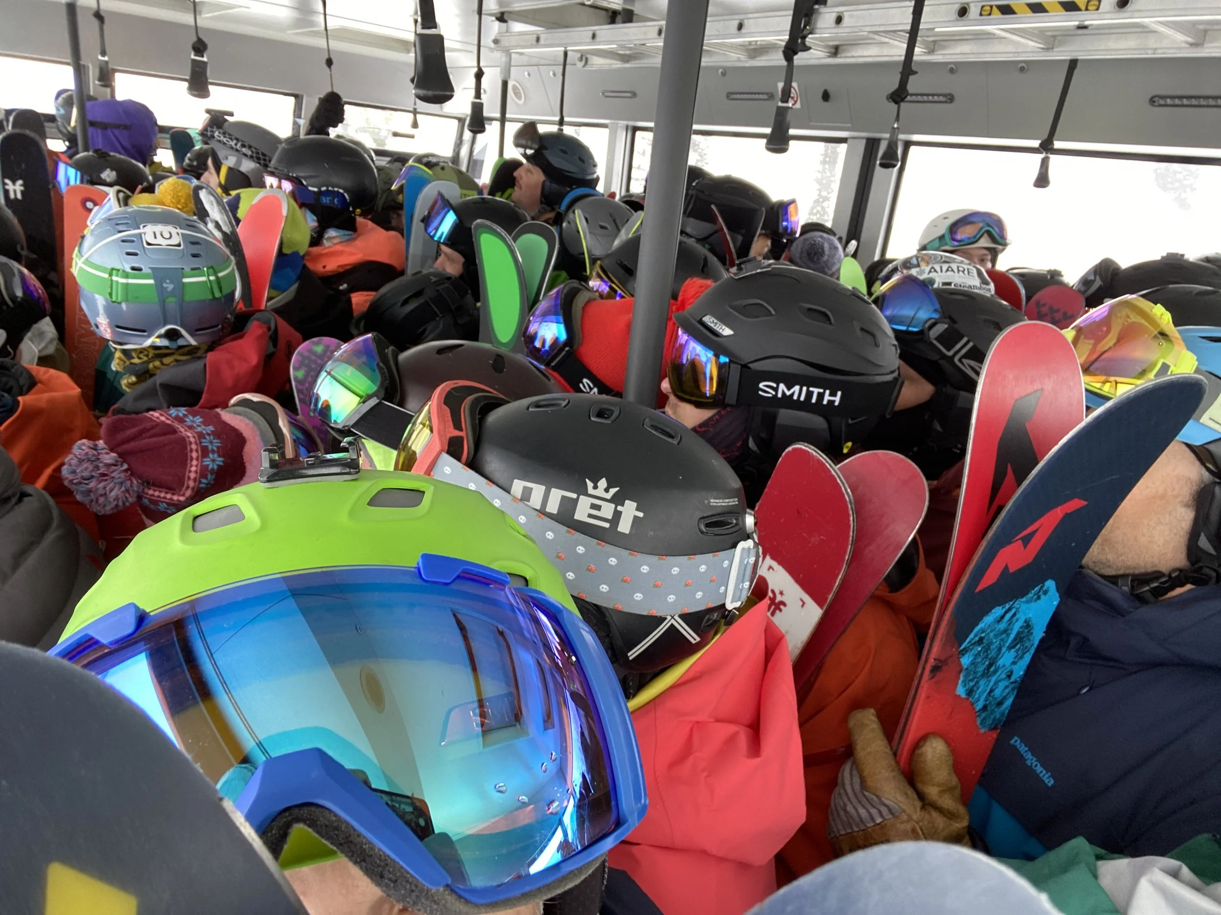 The tram at Jackson Hole is abuzz as it whisks skiers to the summit of Rendezvous Mountain.